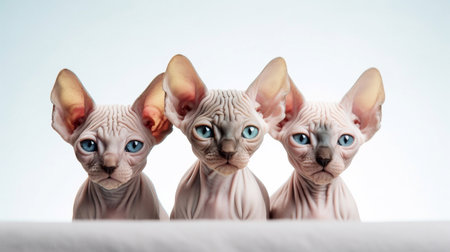 Three Sphynx cats with blue eyes on a white background.