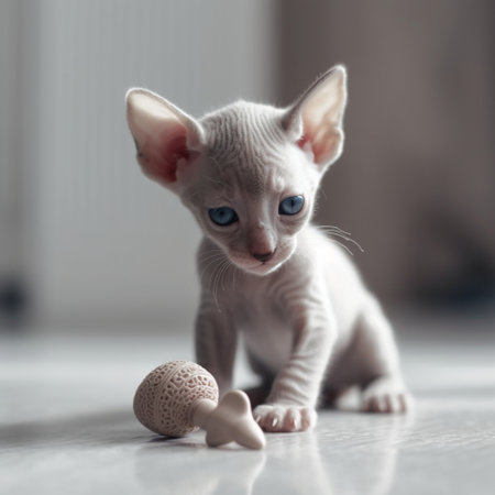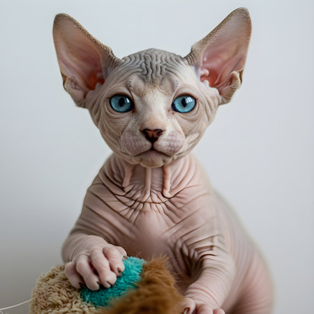 A cute Minskin kitten plays with a toy mouse, with its distinctive short legs and hairless body making it a unique and fascinating feline.
