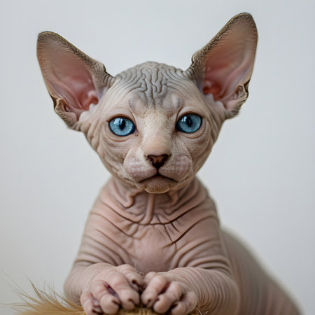 Close-Up of a Sphynx Cat with an Intense Gaze Against a Soft Monotone Background, Enchanting Beauty