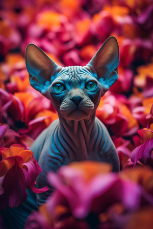 Sphynx cat sitting on flower petals. Petal background.