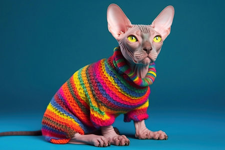 Colorful Portrait of a Distinctive Sphynx Cat Wearing a Colorful Sweater, Generative AI
