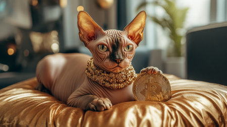 Sphynx cat displaying Bitcoin on golden pillow
