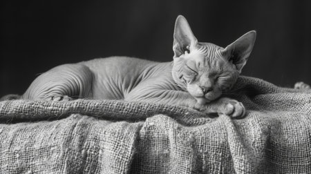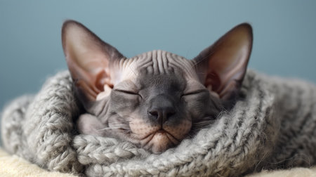 A Sphynx cat peacefully sleeps wrapped in a cozy blanket, enjoying the warmth of natural light. This tranquil scene captures the essence of relaxation and comfort.