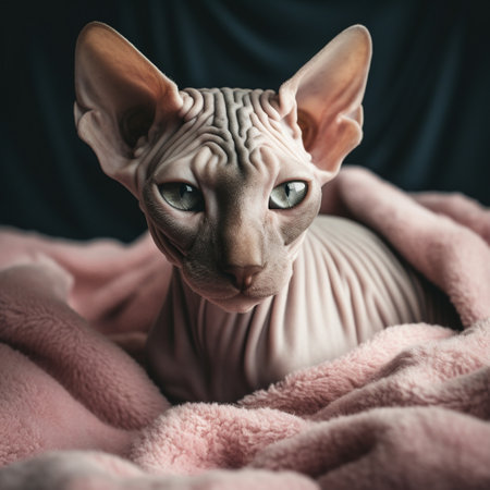 This image features a hairless Donskoy cat resting on a soft, fuzzy blanket, with a pair of bright, inquisitive eyes and a distinctive wrinkled skin that gives it a unique appearance. With its charming personality and unusual appearance, this breed is known for being an affectionate and engaging companion.