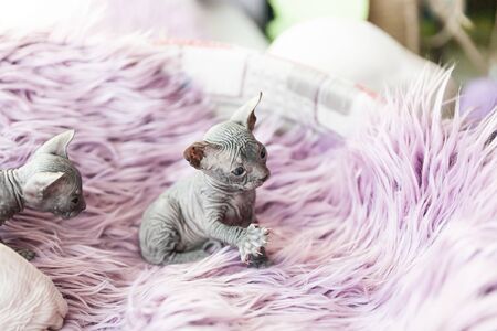 gray one month old Don sphynx cat portrait on lilac fur background