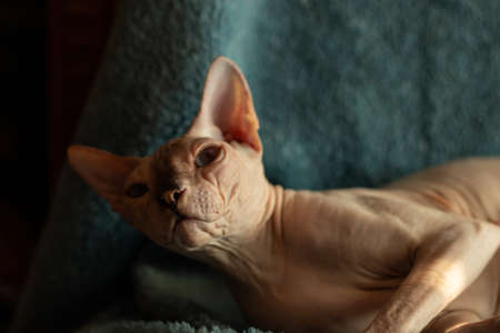 A bald cat of the Sphynx breed He warms himself at home under a warm blanket. Pedigree pet care concept. Photo for a veterinary clinic or pet supply store.