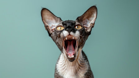 Cornish Rex, angry cat baring its teeth, studio lighting pastel background