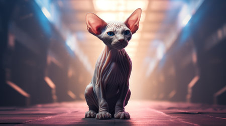Purebred pedigreed Sphynx kitten with white hairless skin and blue eyes on stage in the spotlights at exhibition of purebred cats. Cat show. Best cat, winner. Advertising, poster, banner, Announcement