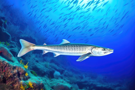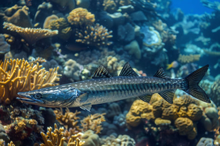 a barracuda cruising above a colorful coral reef, created with generative ai