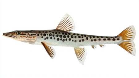 Spotted Gar displays its unique pattern of spots on a streamlined body while gliding through a bright clear background illustrating its aquatic elegance and beauty.