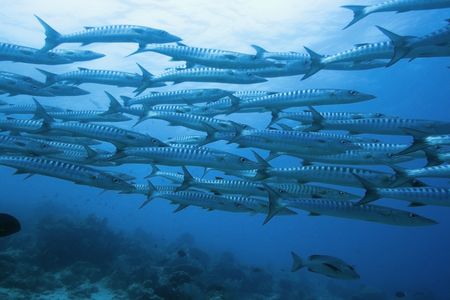 Underwater view of a school of barracuda swimming through clear blue ocean water