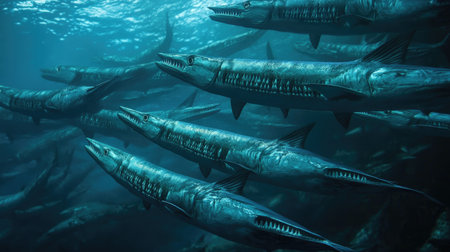 A school of barracudas swimming in formation, their sharp teeth and streamlined bodies ready for a hunt.