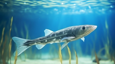 an underwater view of a sturgeon near a pebbly river bed, created with generative ai