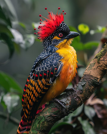 A stunning bird with a vibrant crest perches gracefully on a branch. This close-up captures the bird's intricate feather patterns and colors in a serene natural habitat.