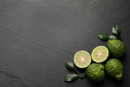 Fresh ripe bergamot fruits with green leaves on black table, flat lay. Space for text