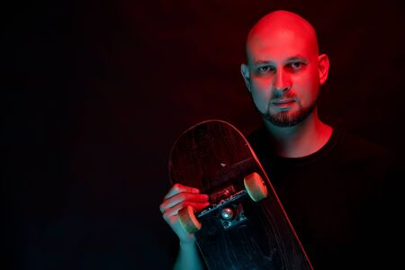Skateboarder in black shirt with skateboard on neon light background