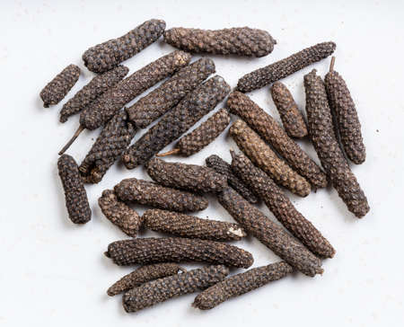 top view of java long pepper close up on gray ceramic plate