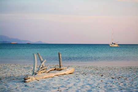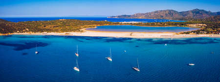 Panoramic view of sandy beach, yachts and sea with azure water, in Villasimius, Sardinia (Sardegna) island, Italy. Holidays, the best beaches in Sardinia. Porto Giunco beach, Villasimius, Sardinia.
