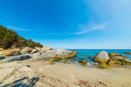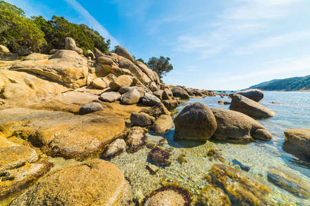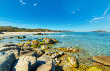 Clear water and rocks in Orri Beach in the springtime. Sardinia, Italy