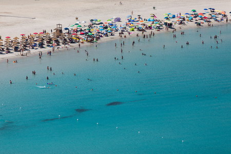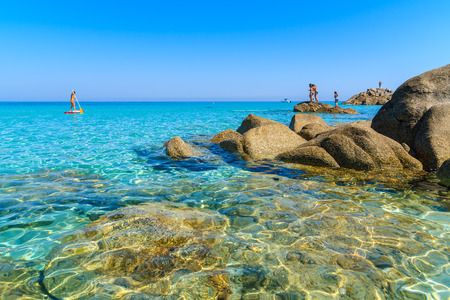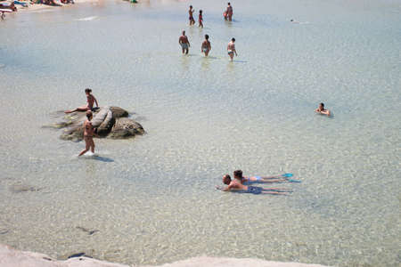 Costa Rei, Italy - August 25: Unidentified people in beach called Scoglio di Peppino. Sunny day in summertime, crystal water like a natural pool on August 25.2015 in Costa Rei, Italy as editorial