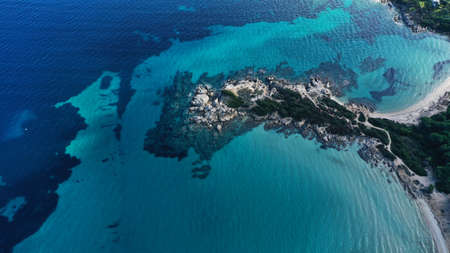 Aerial view of Vourvourou beach, small peninsula in turquoise water of Aegean sea. Waves beating cliff rocky coastline. Halkidiki, Greece.