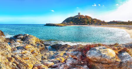 View of beautiful Chia bay and wonderful beach with Torre di Chia tower. Location: Chia, Sardinia, Italy Europe