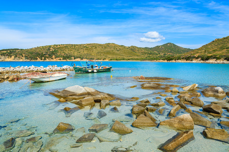 Old fishing boats on turquoise sea water of Punta Molentis bay, Sardinia island, Italy