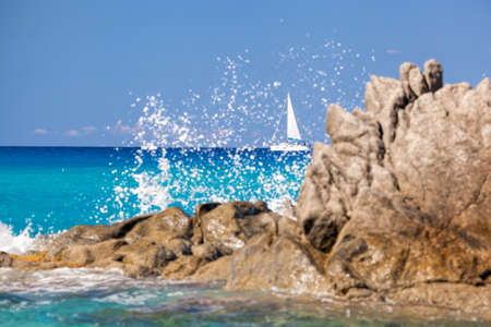 Azure coast of Calabria with sailboats on open sea in Vibo Valentia, Calabria, Southern Italy
