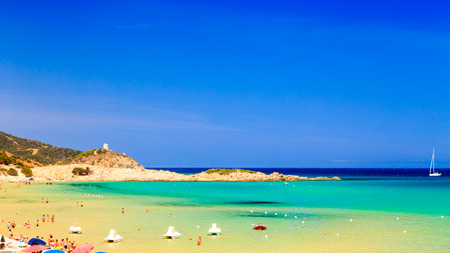 Porto Giunco, Italy - June 05: Unidentified people in beach Porto Giunco (Villasimius). Sunny day with people in the beach, transparent sea in summertime, and historical tower on the nountain behind on June 05.2015 in Villasimius, Italy as editorial