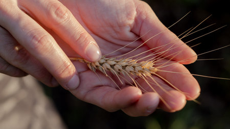 Farmer girl holds wheat spikelet in her hands. Womans hands check the quality of spikelet wheat .The spikelet of ripened wheat in the glare of the sun.