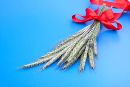 Blue paper background with ears of wheat on one side.