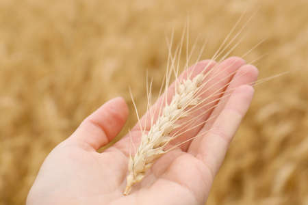 Farmer or agronomist in ripe wheat field, examining the yield quality. Hand holding the golden wheat straw. Close up. Selective focus.