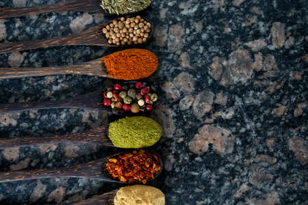 variation of spices on the vintage silver spoons, all spices on the table, colorful food background
