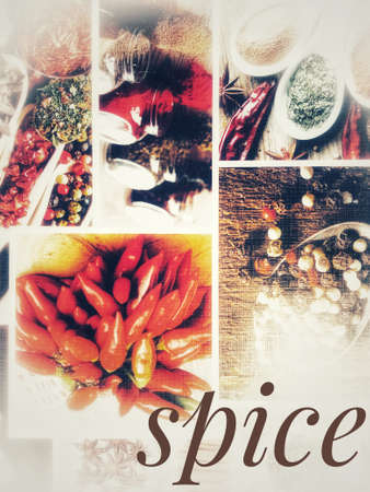 variation of spices on the vintage silver spoons, all spices on the table, colorful food background