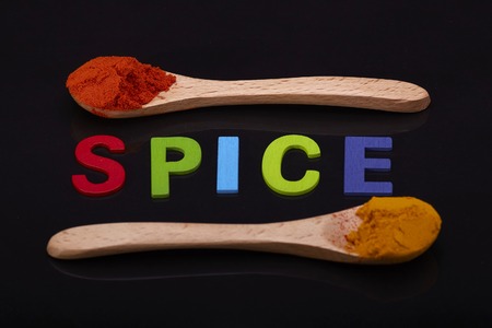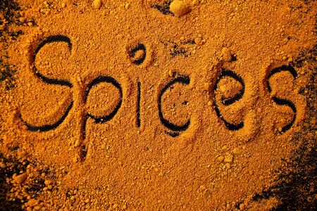 The text Spice written on a spicy mixture of powdered turmeric, red pepper and coriander powder on a grey stone.