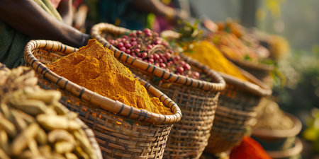 Banner of Indian, Asian spices. A line of people in vibrant traditional costumes harvest spices and herbs. A typical scene in African markets. Spices for Indian, Asian and Mexican food. High quality photo