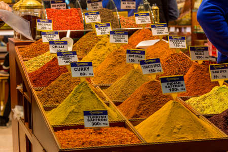 Colorful Spices with price tags in Spice Bazaar (Egyptian Bazaar) of Istanbul, Turkey.