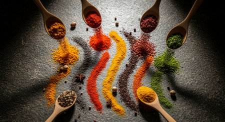 Vibrant array of colorful spices, including turmeric, paprika, chili, and herbs, artfully poured from wooden spoons onto a dark textured surface, creating dynamic wavy patterns. Aromatic ingredients for cooking and culinary use.