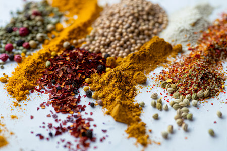 A close-up photo of various spices, including turmeric, coriander, and paprika, scattered on a white surface.
