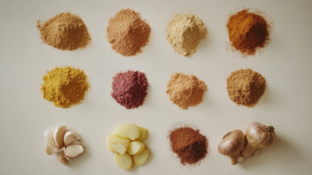 A visually appealing layout featuring various spices and herbs displayed in their ground forms alongside fresh garlic and onion, perfect for culinary uses.