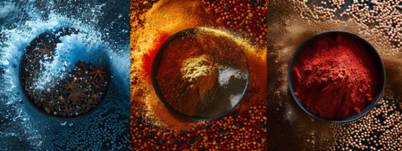 A dynamic and vibrant composition of various spice powders in motion, including paprika, turmeric, and star anise, with splashes of color against dark backgrounds. The energetic and bold visuals are perfect for themes related to cooking, spices, and culinary creativity.