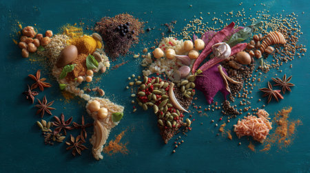 This stunning image showcases a world map created from an array of vibrant food ingredients such as spices, grains, and vegetables, highlighting global culinary diversity.