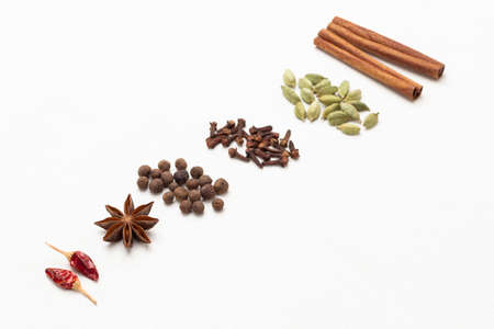 Spices lie in a row diagonally across the frame. Cinnamon sticks, cardamom, cloves, allspice, star anise, and red pepper pods. top view. white background