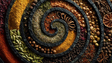 A stunning arrangement of various spices and seeds on a dark surface, highlighting the vibrant colors and natural textures of culinary ingredients ideal for food photography.
