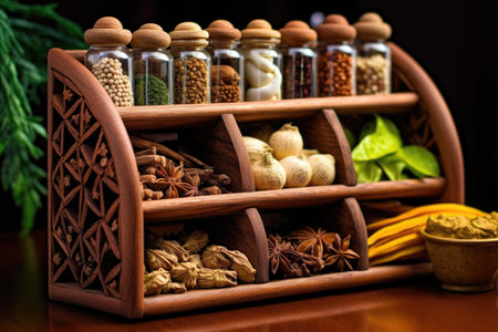Visualize a harmonious display of carefully selected herbs and spices in a spice rack, hinting at the practice of mindful cooking --chaos 30 --ar 16:9 --v 6.1 Job ID: d78f1a2c-223f-4c28-a2c9-0bb3fcaa524d