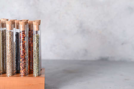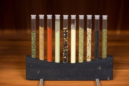 Test tubes with different spices arranged on stand. Biotechnology concept