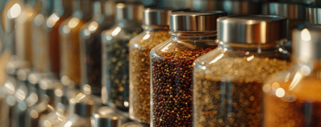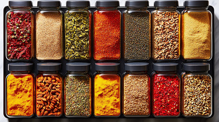 A vibrant arrangement of various spices stored in glass jars. This visually appealing display showcases the rich colors and textures of ingredients ideal for culinary use.