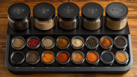 A modern spice rack with glass jars filled with colorful spices, neatly arranged on a black stand, set against a warm wooden surface.