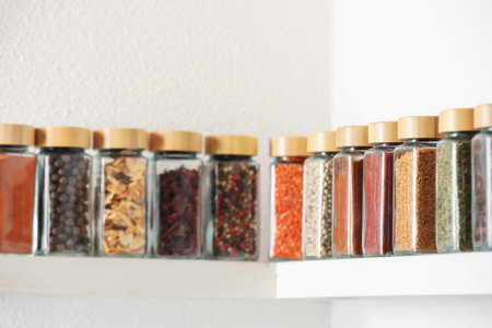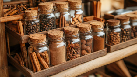 A stylish arrangement of assorted spices in glass jars with cork lids, displayed on a wooden shelf. Perfect for adding flavor and decoration to any kitchen.
