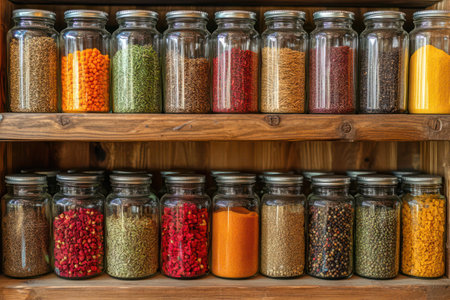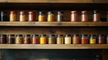A neat arrangement of jars filled with various spices and dried ingredients on wooden shelves, showcasing a vibrant collection ideal for culinary enthusiasts.